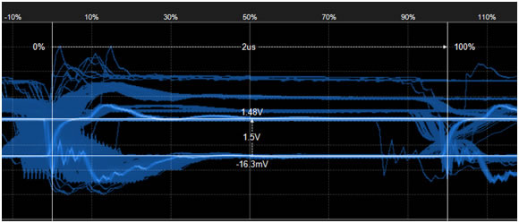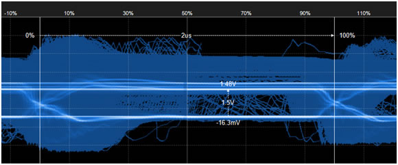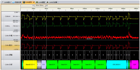 The ID 0 x331, 0 x332, 0 x333 frame waveform doing eye diagram, as shown in figure 5. CAN clearly see the CAN waveform amplitude is 1.5 V (those with high amplitude and other frame is raised when the arbitration).