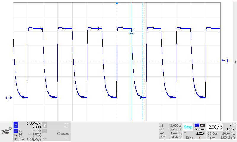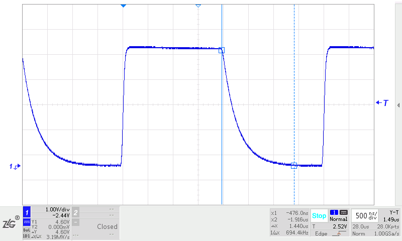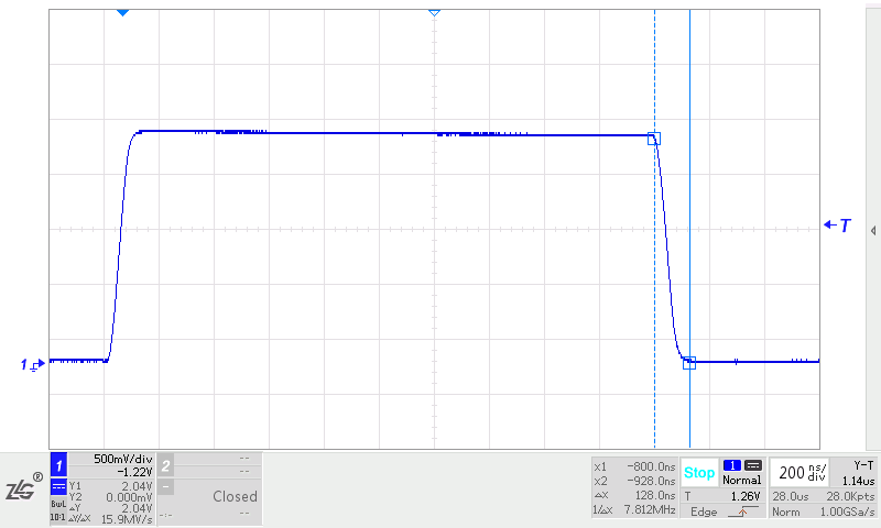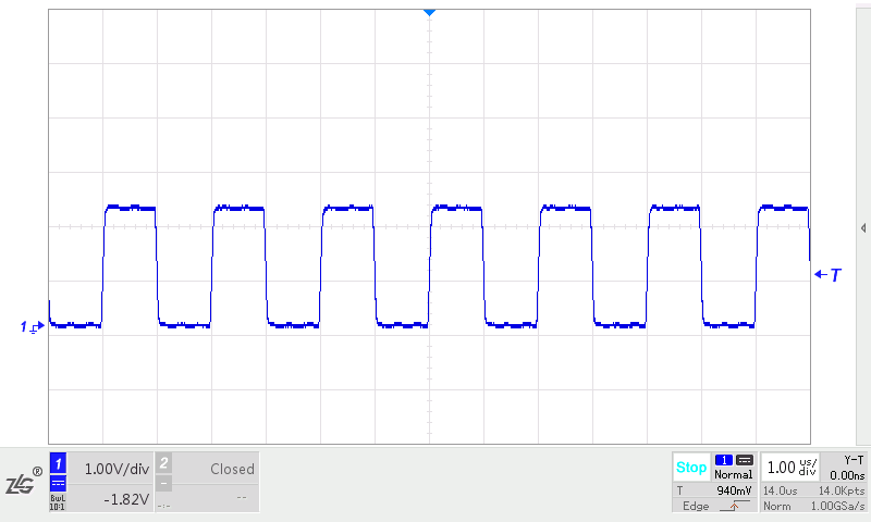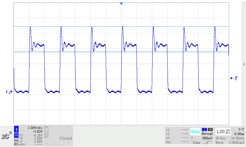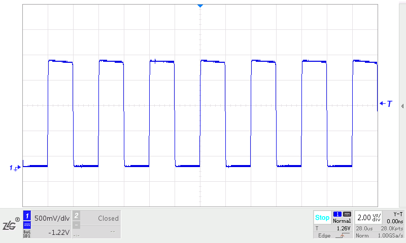 If add a twisted-pair cable end 120 Ω resistance, terminal signal waveform, ringing disappeared, as shown in figure 7.